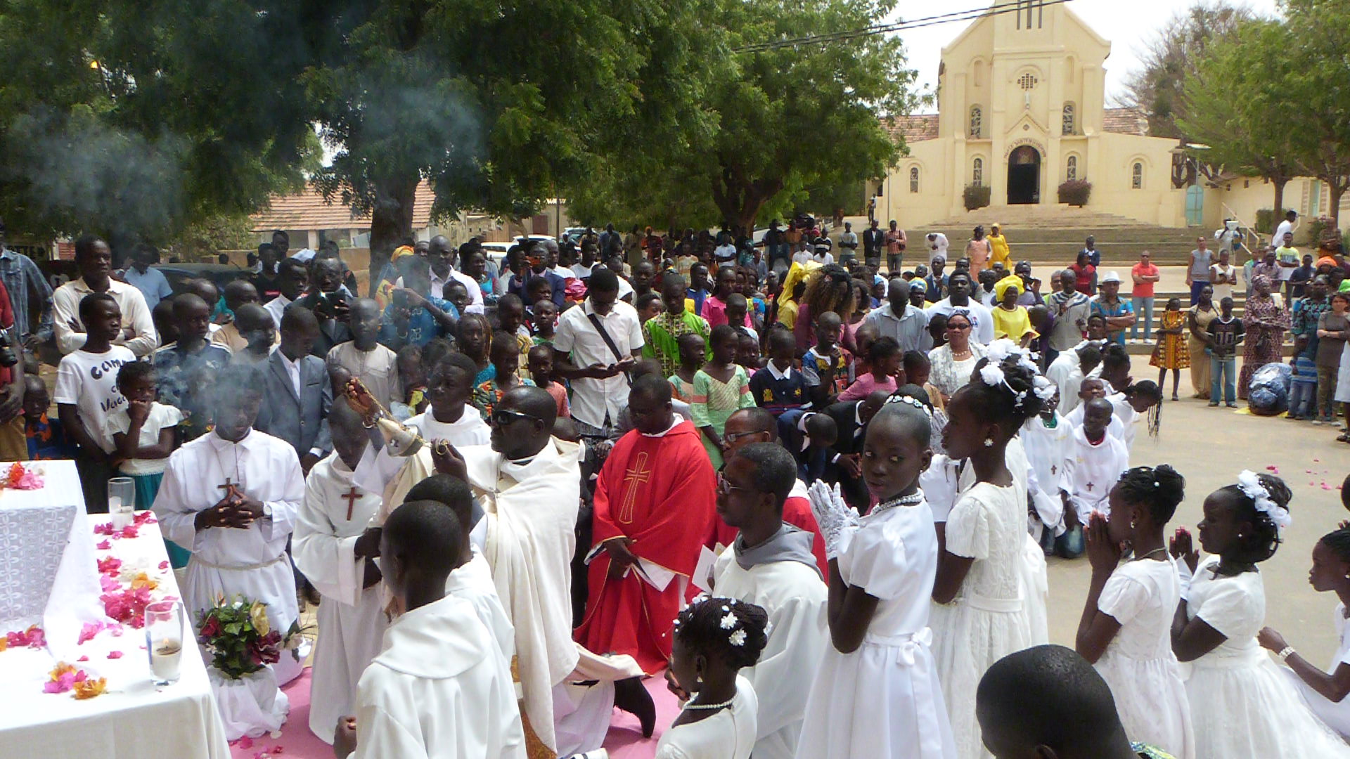 Abbé Robert Dimé Ndour a célébré la messe dans la Basilique Notre Dame de la Délivrande, archi pleine. Les 35 enfants consacrés et leurs familles ont fait une procession dans les ruelles de Poponguine.